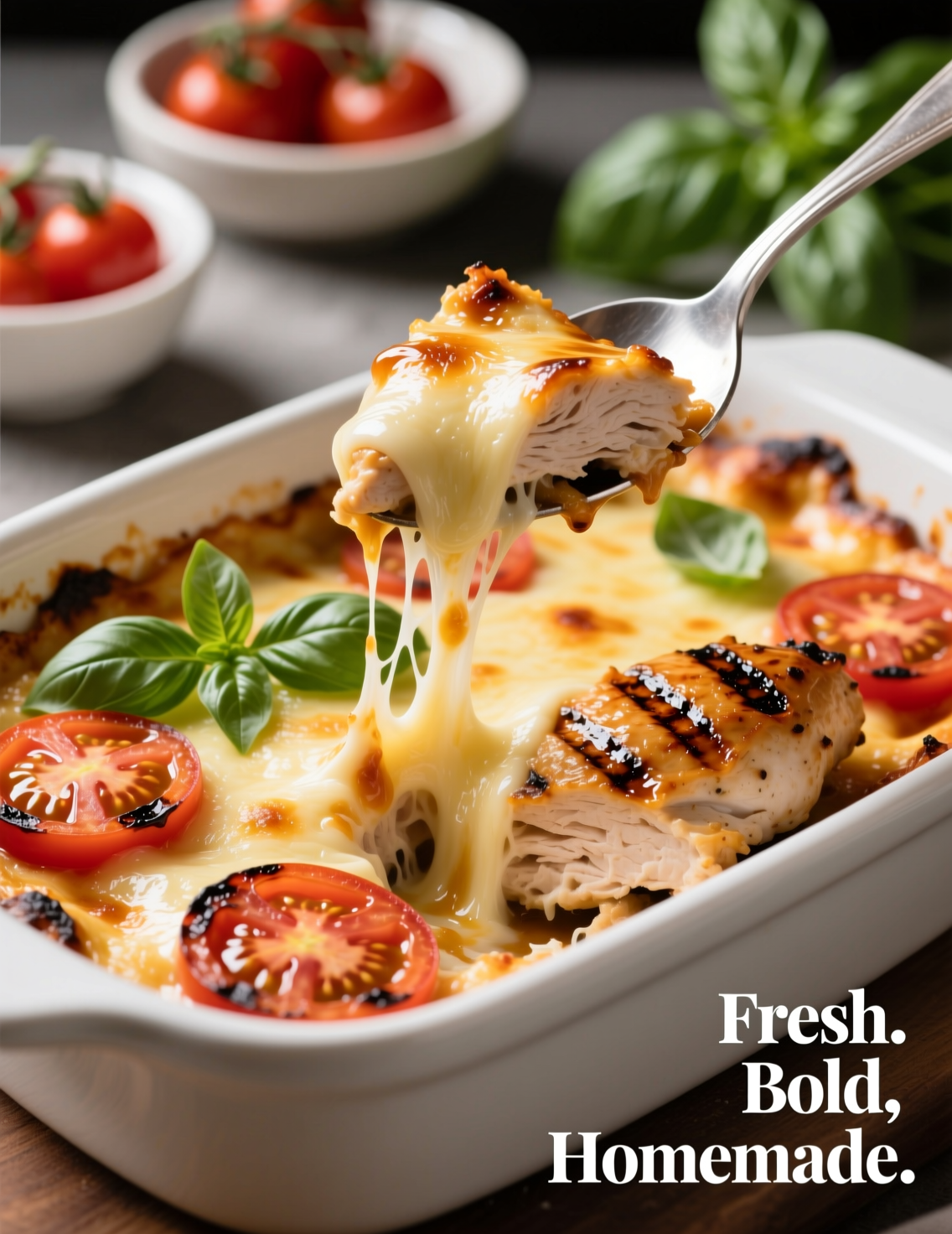 It’s a baked chicken dish layered with tomatoes, mozzarella, and basil, inspired by the classic Italian Caprese salad.