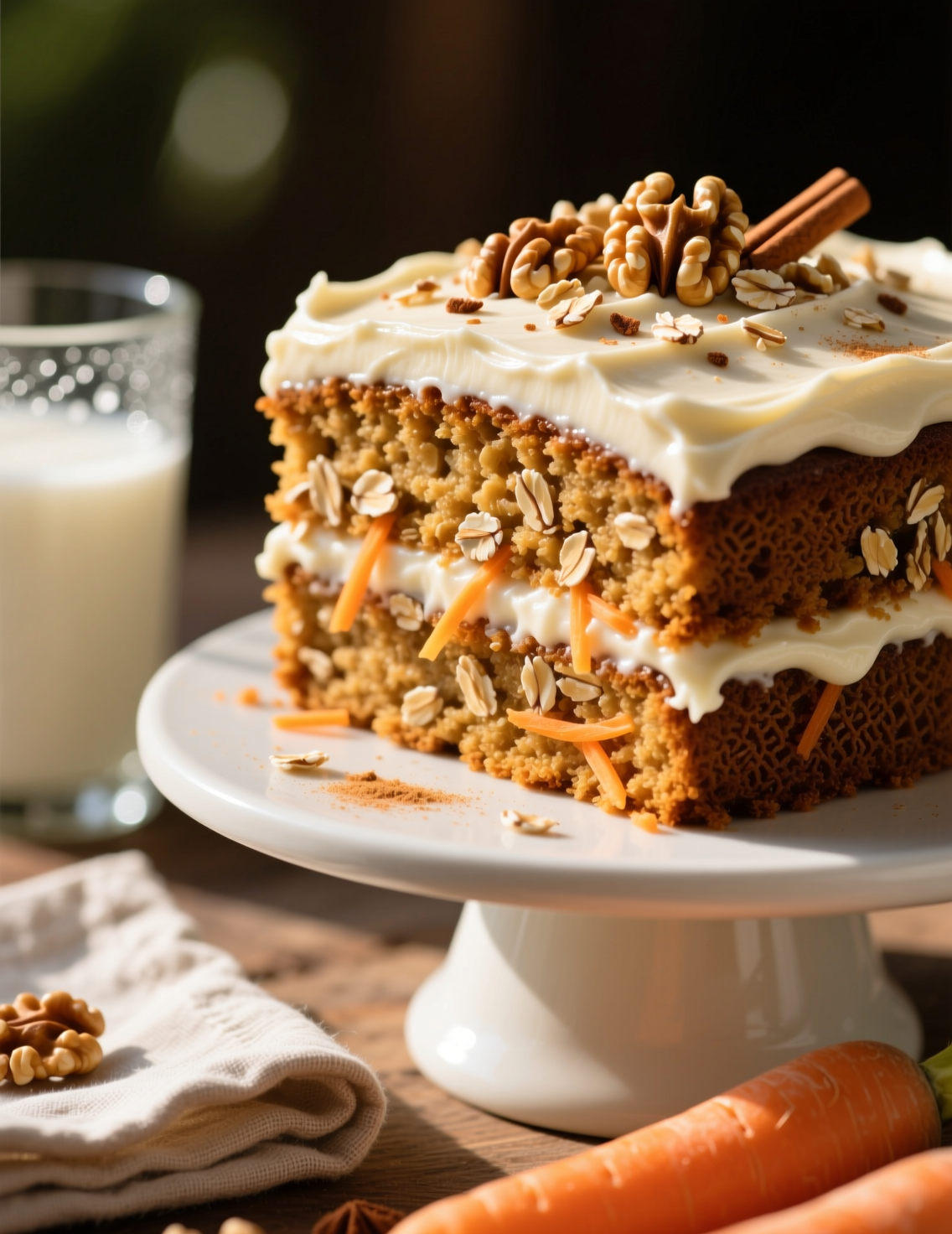 Oats bring fiber, beta-glucans, and a wholesome nuttiness. Unlike refined wheat flour, oats absorb moisture gradually, making the crumb moist and lasting longer. This is why your cake will taste even better on day two—a small baker’s secret that never fails.