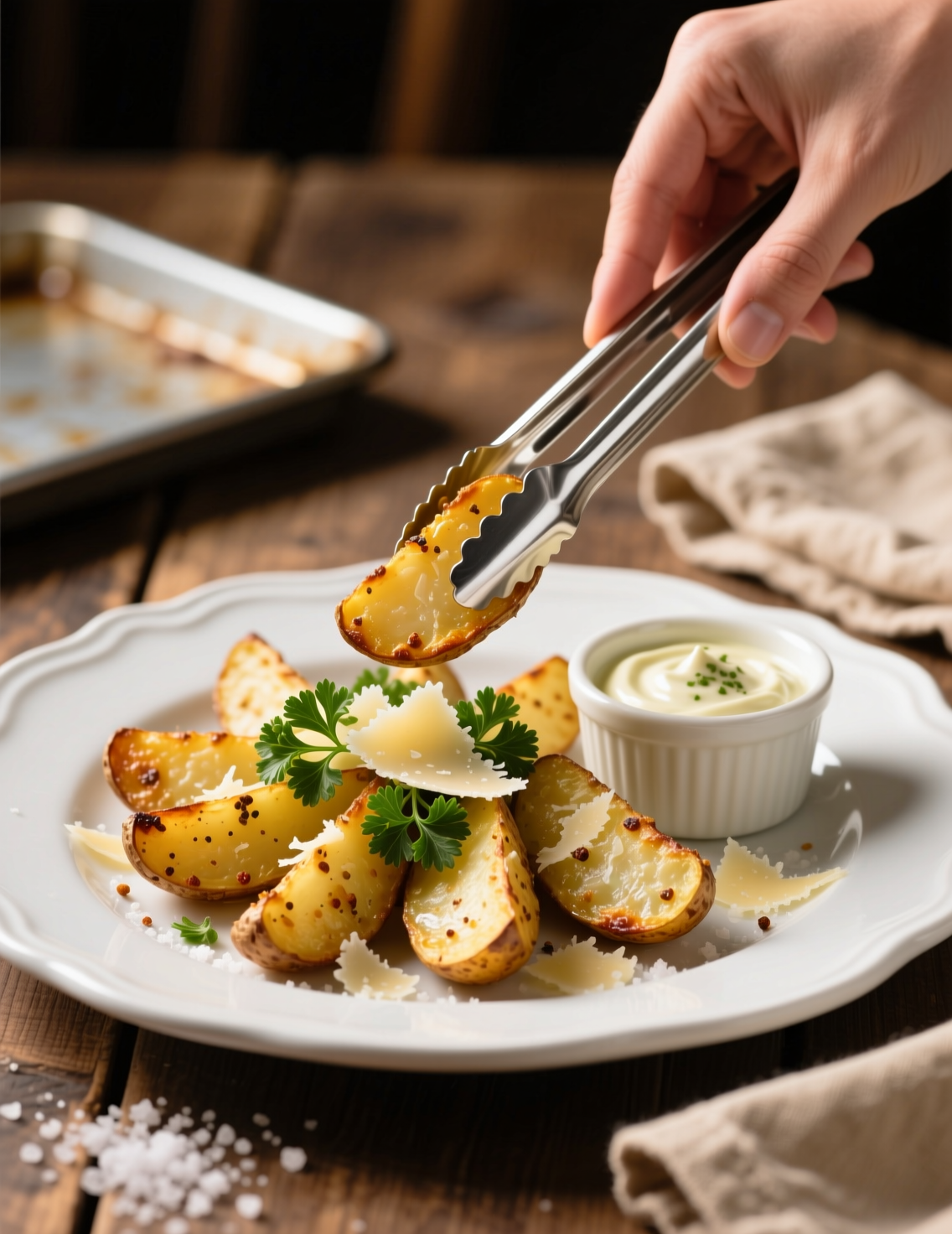 Roast in the preheated oven for 20 minutes. Don’t open the door, no matter how tempting that garlic smell is. After 20 minutes, flip each wedge carefully using tongs. Sprinkle the grated Parmesan evenly over them. Return to the oven for another 15 to 20 minutes, until the cheese crisps and the potatoes turn a rich golden brown.