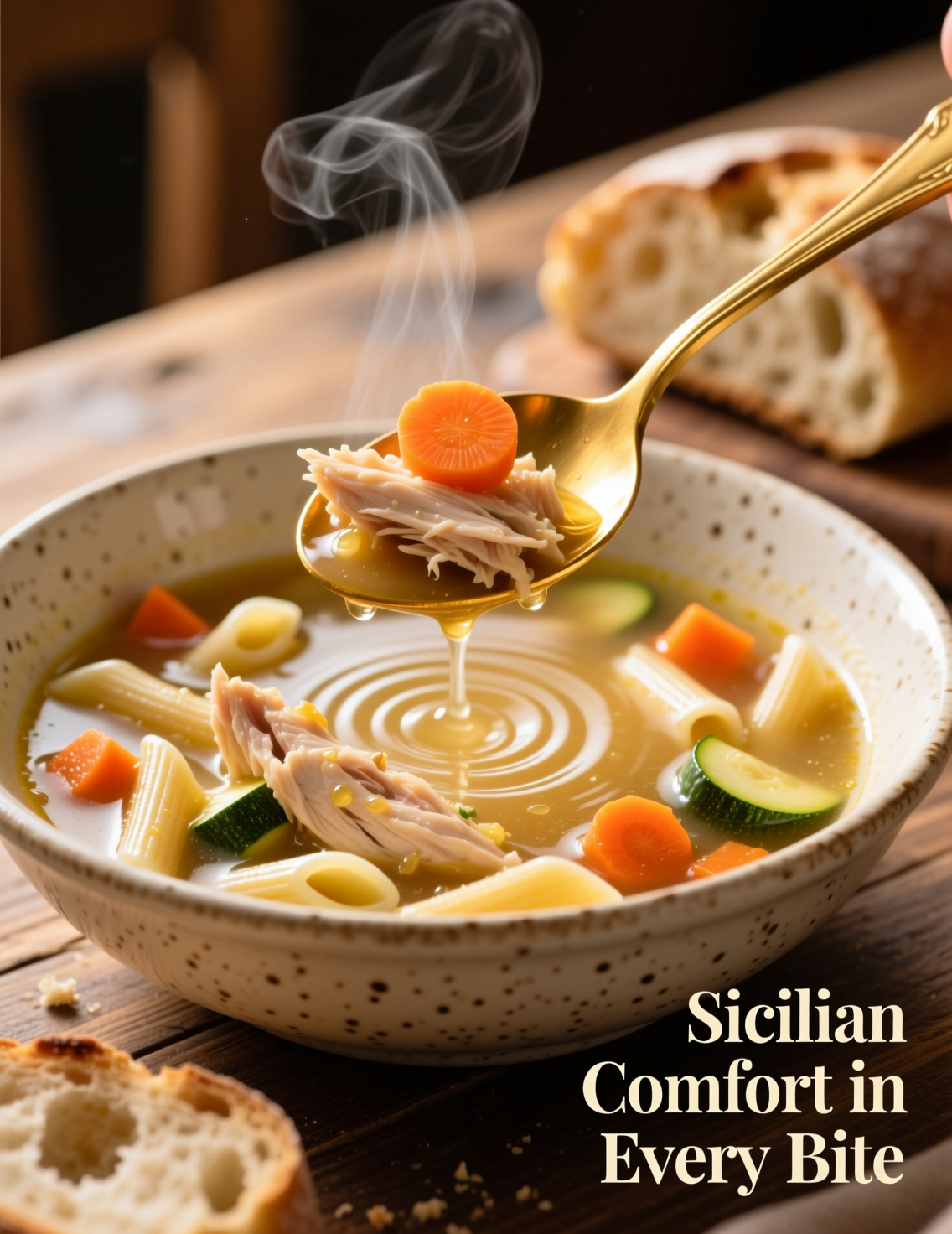 The base almost always begins with sofrito—celery, carrots, onions, and garlic cooked slowly in olive oil until they smell irresistible. The Sicilians then add tender pieces of chicken, often with bones in, because bones mean flavor. Tomatoes add brightness, while pasta—usually broken spaghetti or small ditalini—turns the soup into something almost stew-like.