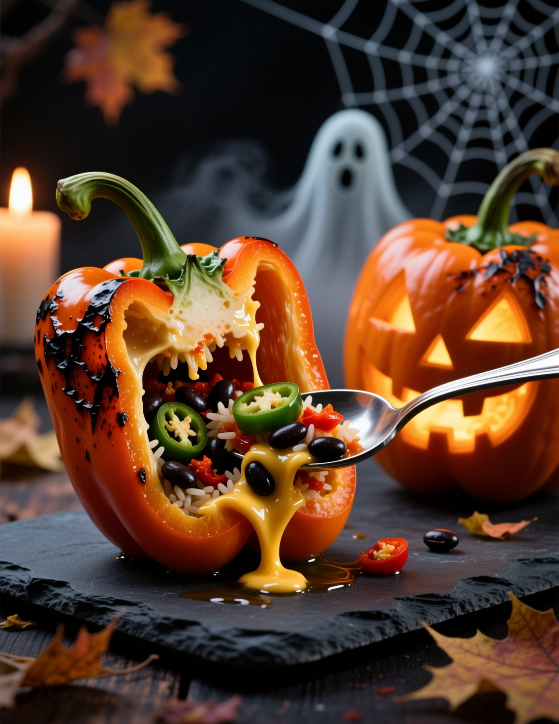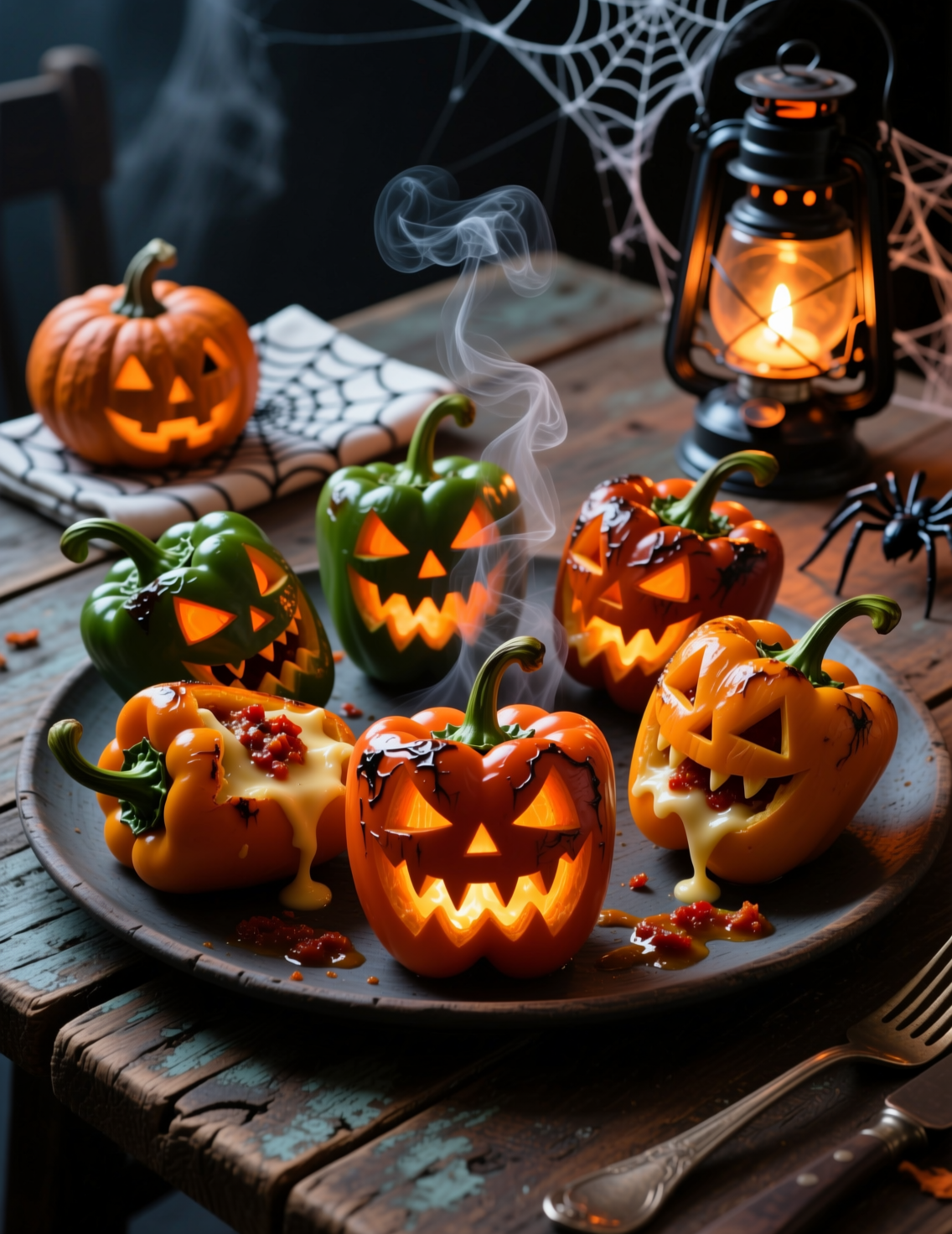Phantom peppers alone delight, but the full effect comes with the plate presentation. Serve them over black rice or squid-ink pasta for a graveyard aesthetic. Garnish with parsley sprigs that look like creepy tendrils.